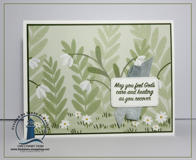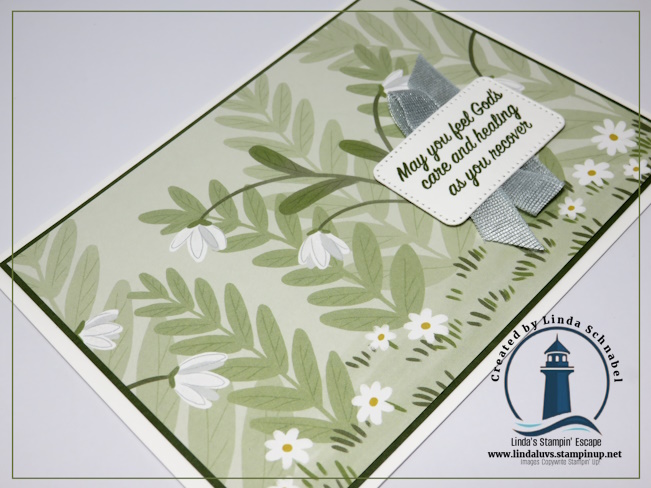The greeting comes from the Prayers & Promises Stamp Set and was stamped in Mossy Meadow, keeping the sentiment soft and coordinated with the rest of the card. I love how this sentiment complements the gentle, caring feel of the design without distracting from the artwork.