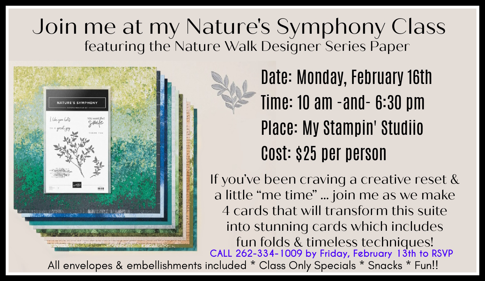 If you’ve been craving a creative reset or a little “me time”… my Nature’s Symphony Class is exactly what you need. We’re taking the gorgeous Nature’s Symphony suite goodies and transforming them into 4 stunning cards!