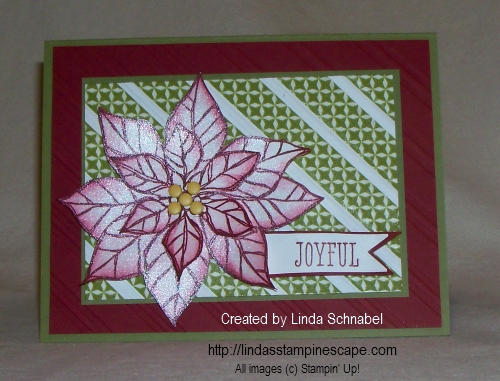 Today I am “joyful” and I’m sharing with you another Christmas card. I know many of my stampin’ friends are already planning their cards, so here’s another sample from the beautiful “Joyful Christmas” stamp set (Wood – 131802 / Clear – 131805) … and you can find that in our Holiday catalog on page 27.