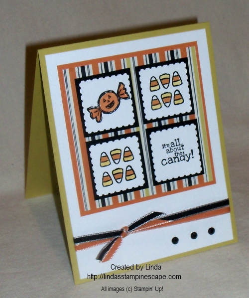 I really was thinking about the candy shop when I was creating this card. I just completed my first two weeks there. The card was really simple to create, something that many of my stampin’ friends (customers) appreciate. Everyone is so busy, quick and simple is always a good thing. Don’t worry … I’ll share some “embellished” card samples too.