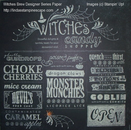 Today’s card uses the stamp set “Halloween Hello” and the “Witches Brew” Designer Series Paper. Love the paper … I think I’m going to frame this sheet and take it down to the candy store with me! What do you think about that idea!
