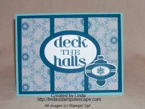 I began with some left over designer series paper from my last stamp camp, and came up with this quick and cute card. My paper is the “Winter Frost Specialty Designer Paper” located on page 29 of the Holiday catalog.
