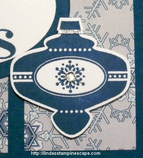 I wanted to jazz it up a bit more, so I added one of those cute new ornaments from the “Christmas Collectibles” stamp set. And talk about making life easier … Stampin’ Up! has a coordinating punch, the “Christmas Ornament” punch so we don’t have to cut these out! Both of these items can be found on page 35 of the Holiday catalog.