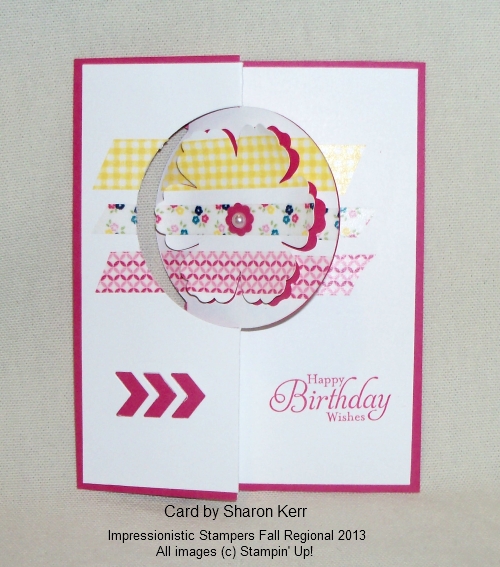 The first is a card made by Sharon Kerr who used our new “Circle Card Thinlits Die” (133480) that was introduced this fall. It made flip cards quick and easy… just roll it through your Bigshot!