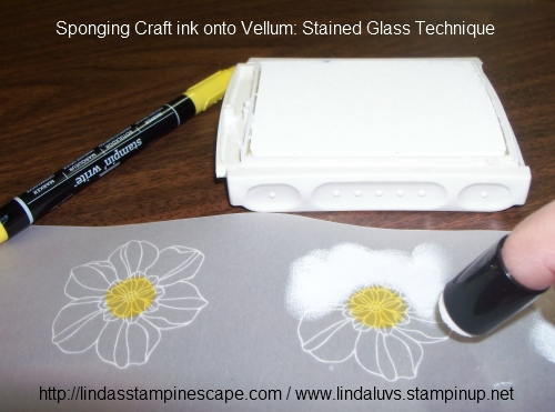 It began (a week ago) with the idea of spring and daffodils, and I love the traditional white with yellow center daffodils. I embossed the image onto vellum cardstock and then flipped it over and sponged the white Craft ink onto the back using a Sponge Dauber (love those little things). The center was colored in with the Daffodil Delight Stampin’ Write Marker.