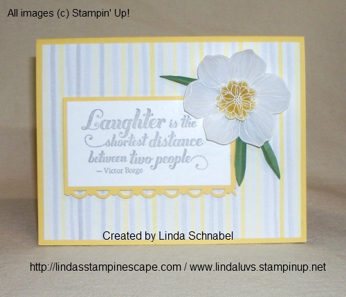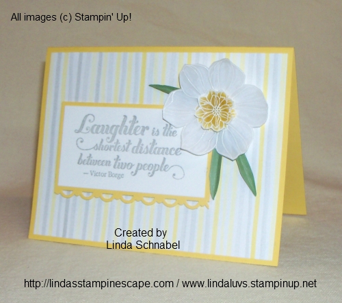 I chose my greeting, and it’s in honor of all my stampin’ friends “Laughter is the shortest distance between two people”… and hugs, they are a very short distance too 🙂