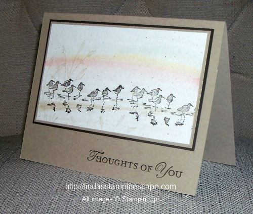 The sandpipers come from the “Wetlands” stamp set. The simple reflections are already on the stamp so no extra work required. Just image them running down the beach. I can almost hear the sandpipers call!