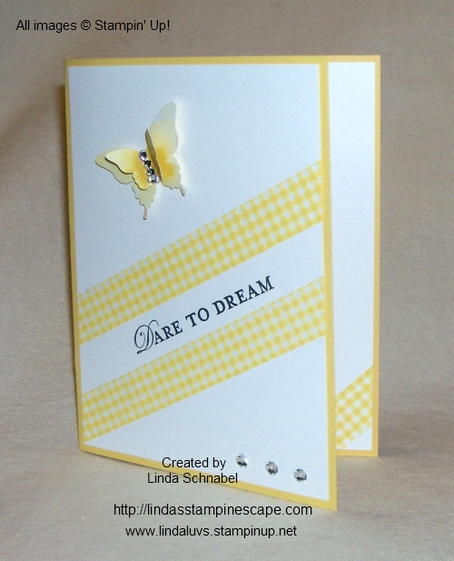 I finished off my card by anchoring it with the 3 rhinestones at the bottom. If you haven’t guessed my color pallet by now … I used Whisper White and the beautiful Daffodil Delight.
