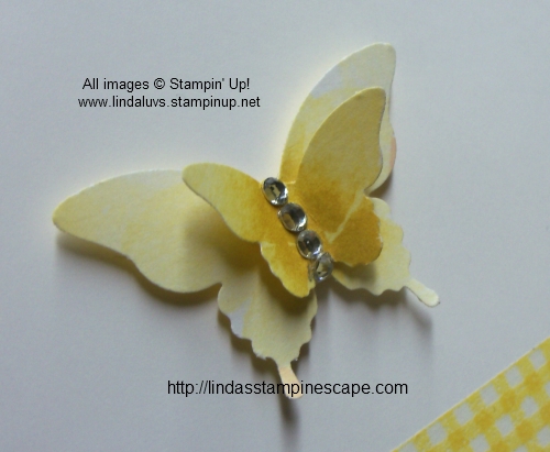 My butterflies were created by layering the punched Bitty Butterfly over the Elegant Butterfly. I just love the way this looks … oh, and I used the “Watercolor Wonder” designer paper to punch the butterflies out of. I used the “string” of rhinestones for the butterfly body.