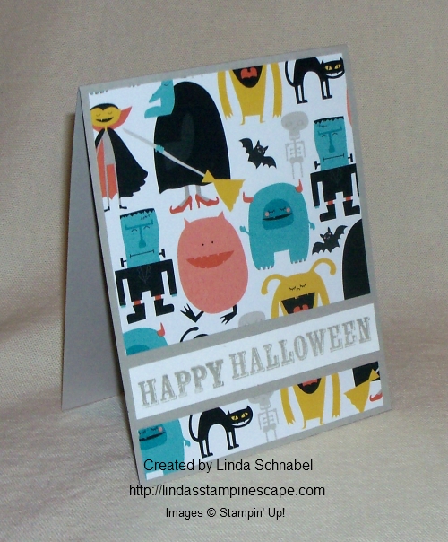 Today’s card share is all about the layout and showcasing the designer paper … Motley Monsters! This is the last in my Halloween series of cards and super simple to make!