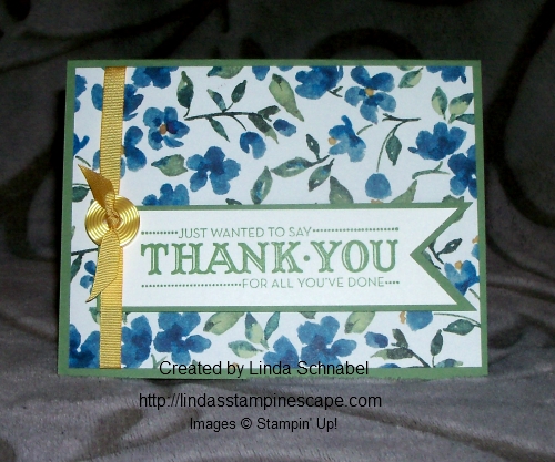 I chose the blue flower pattern for today’s card and highlighted the yellow centers by adding the button and ribbon from the Sale-a-bration bundle!! The base of the card and mat on the greeting is Wild Wasabi.