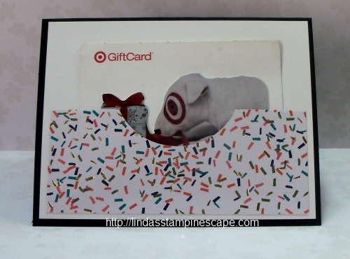 Today’s card has an added little punch to it … the little birthday cake from the “Amazing Birthday” stamp set. Also, if you flip open the card, you will see that I’ve added a bit more of the Birthday Bash paper to create a pouch for a gift card!