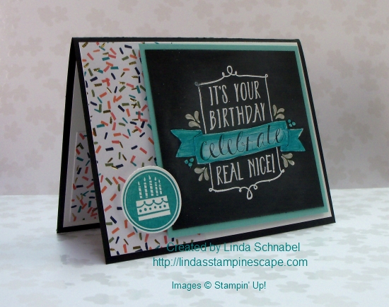 Using designer paper on a card is a very cost effective way to jazz up your card and I used the “Birthday Bash Designer Specialty Paper” for this card. I love the confetti and glitz on this pattern.