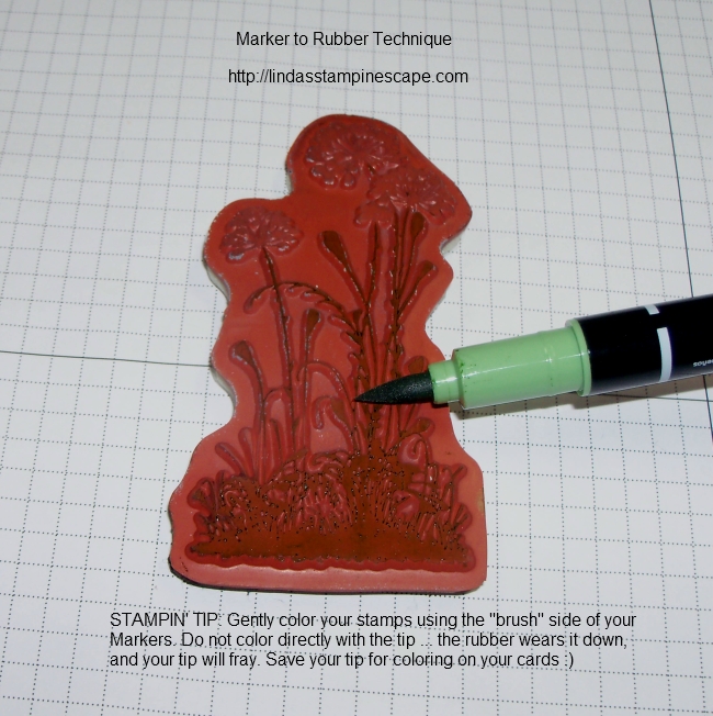 I teach my stampers how to hold the marker when coloring a rubber stamp … because it can be rough (due to the design) Lightly color your image with the side of the marker, never the tip. It will save your tip from fraying.