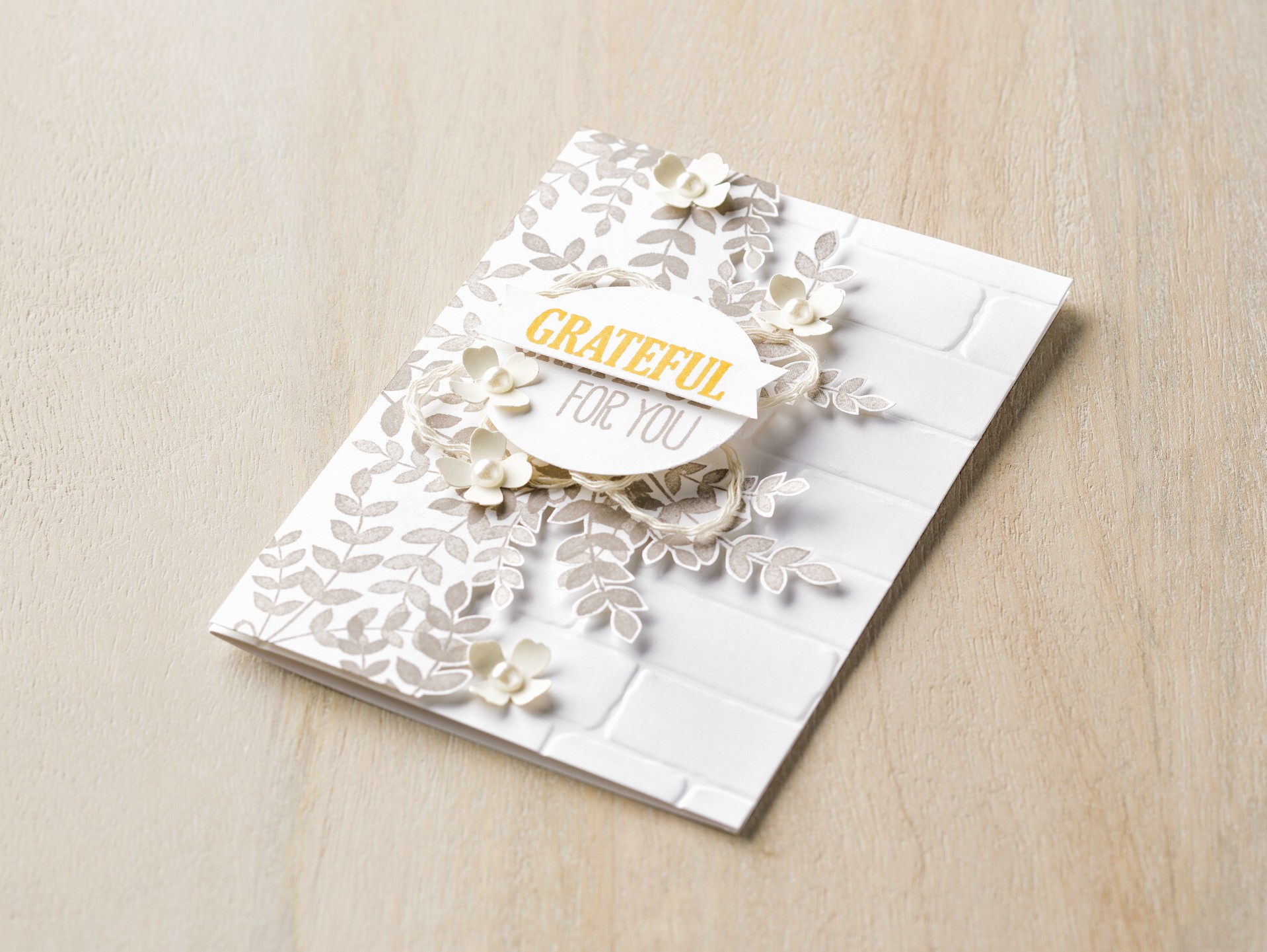 The neutral color scheme and the simplicity of the card is striking! The new “Brick Wall” embossing folder makes the leaves pop … literally and figuratively. My guess is that the leaves were cut by hand, but well worth the effort.