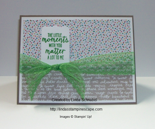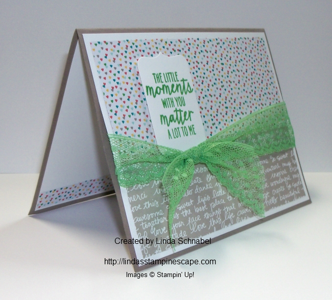 I cut out my greeting with one of the framelits from the “Chalk Talk” set, and then popped it up with Stampin’ Dimensionals. I love the verse “The Little Moments with You Matter a Lot to Me” … and if you look closely at the card you can see “awesome together” and “love your face” on the designer paper. Nice combo … don’t you think!?