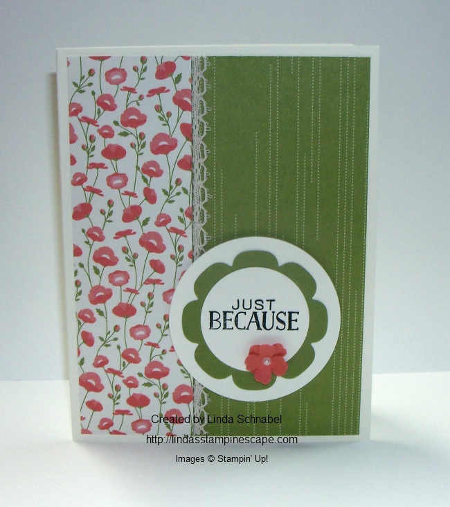 I couldn’t resist adding the delicate lace of the Venetian Crochet Trim … it looks so nice against the floral pattern. My greeting comes from the “Tin of Cards” stamp set. Talk about a set with everything you need …