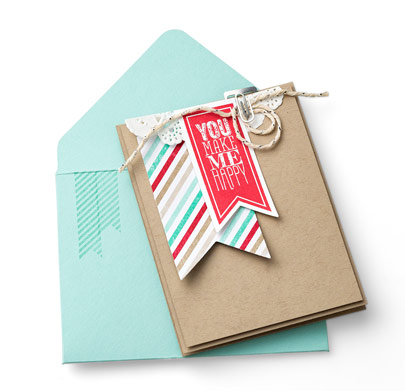 The color pallet fairs well with Crumb Cake and Pool Party Cardstock accented by the “Fresh Prints” designer series paper stack. The greeting is stamped in Real Red using the “Perfect Pennants” stamp set.