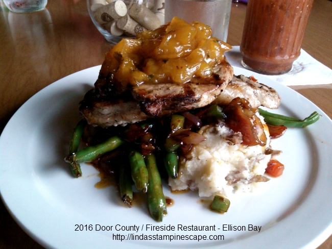 My favorite for our entire trip was the Fireside in Ellison Bay. I had the “Jamaican Pork Chops” – just listen to this … Jerk marinate pork loin with seared peaches and pears, over garlic redskin mashed potatoes and szechuan green beans! OMG …