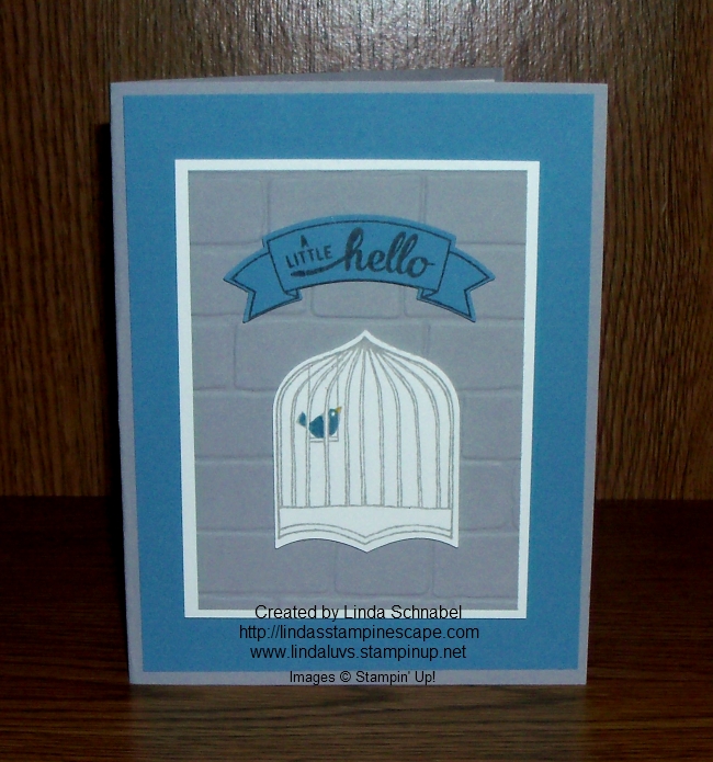 The birdcage was stamped in Smokey Slate, punched with the coordinating “Best Badge” punch and popped up on the background. The background and the base of the card are also Smoky Slate, and the background is embossed with the “Brick Wall” embossing folder.