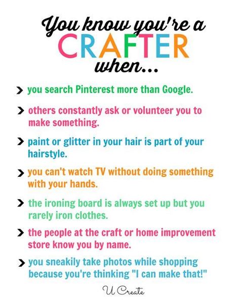 23Feb2017 You Know You’re a Crafter when … Posted in Uncategorized by Linda Schnabel Hello Stampin’ Friends ~ Finally got back on line so I’ll save my card for tomorrow but thought I’d share this with you … Do some of these statements apply to you? I know they do for me … lol Have a nice evening, and I’ll see you tomorrow! Please feel free to share or save ... Click to print (Opens in new window) Print More Click to email a link to a friend (Opens in new window) Email TweetLike Loading... Related