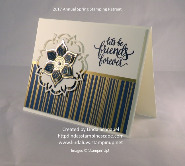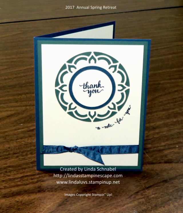 Back today to share another card using the new “Eastern Palace Suite”. This is also one of the cards we did at our Stamping Retreat. Yesterday I shared a simple card that was cut with just one of the many dies included in the set.