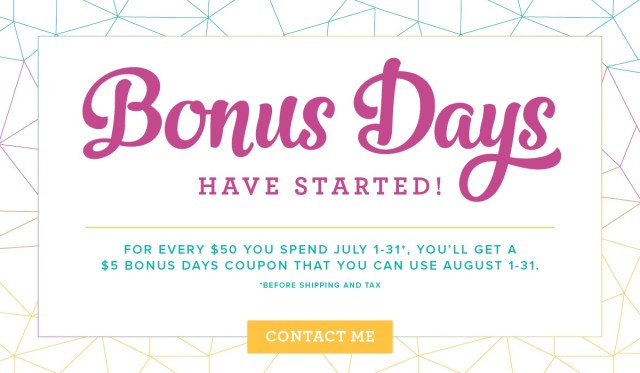 Bonus Days are back! For every $50 you spend July 1–31 (before shipping and tax), you’ll get a $5 Bonus Days coupon that you can use August 1–31.