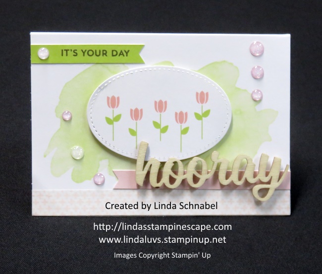 I also used the oval from the Stitched Shape Framelits to cut out the tulips. The “hooray” gives the card added dimension, and I wanted to make sure I used up all the wooden elements from the kit!