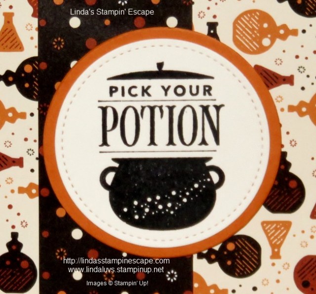 I teamed up with Stitched Framelit Dies along with the Circle Dies to highlight my greeting “Pick Your Potion” and then popped it up with Stampin’ Dimensionals. Did you notice the cute little potion bottle on the background designer paper … I love that Stampin’ Up! create products that can be used together with many different products.