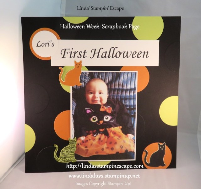 The title was created from my computer, the kitty’s were created from the “Spooky Cat” bundle and “Spooky Night” Designer Series paper. I thought it was appropriate since she was dressed as a little kitty cat!