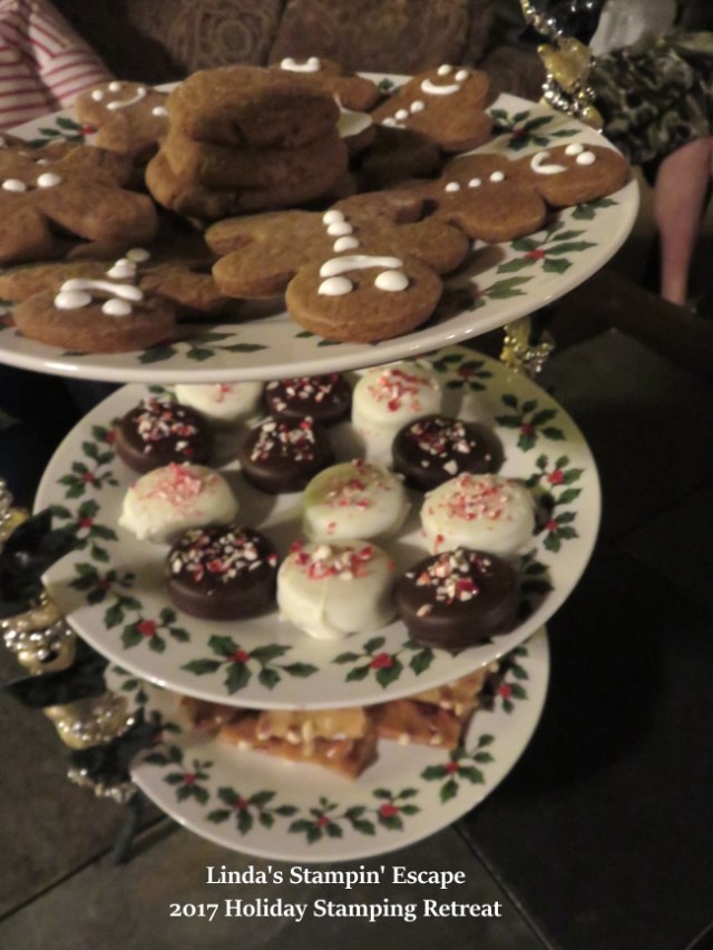 After our Friday night stamp session, we retired back to our house and shared a Hot Chocolate bar which included some hand dipped marshmallow stir sticks and some home-made cookies & peanut brittle … then we sat around the fireplace and enjoyed each others company.