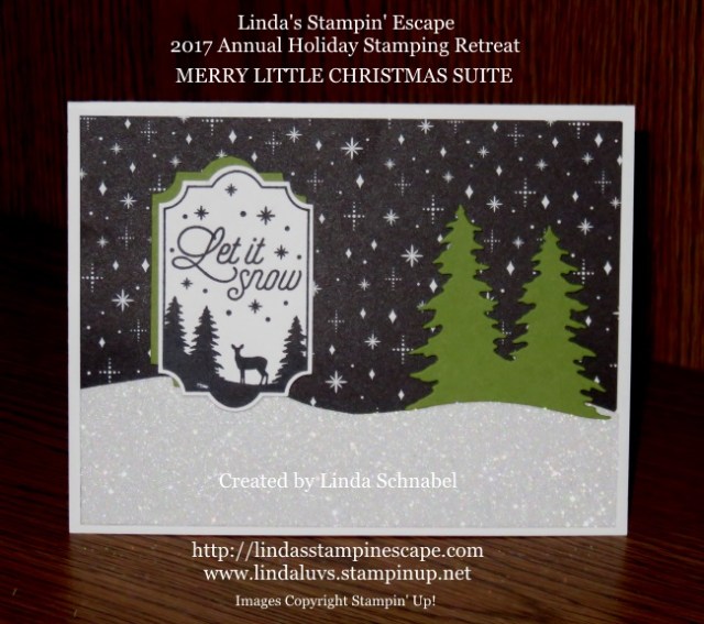 This masculine style card was quick -n- easy and a big hit at retreat. Our background comes from the Merry Little Christmas Designer Series paper. We then cut a snow bank our of a piece of the Dazzling Diamonds Glimmer paper.