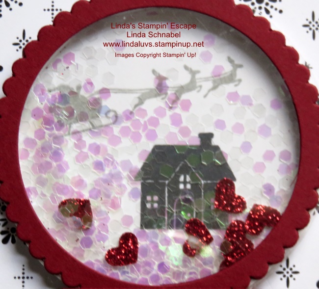 On the white circle, we stamped our house in Black and then our Santa in Smoky Slate. Our next step was to attach the foam adhesive strips to the outer edge of the white circle. Once applied, you can fill this with whatever you’d like … we used a large glitter and Red Glimmer hearts.
