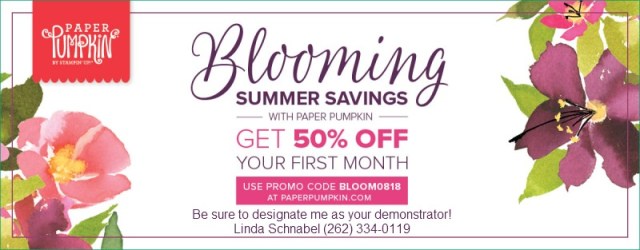#3) Our Blooming Summer Savings promotion is the bridge between the old and the new … New subscribers to Paper Pumpkin will get 50% OFF their first kit when they subscribe using code BLOOM0818 at paperpumpkin.com by August 10.