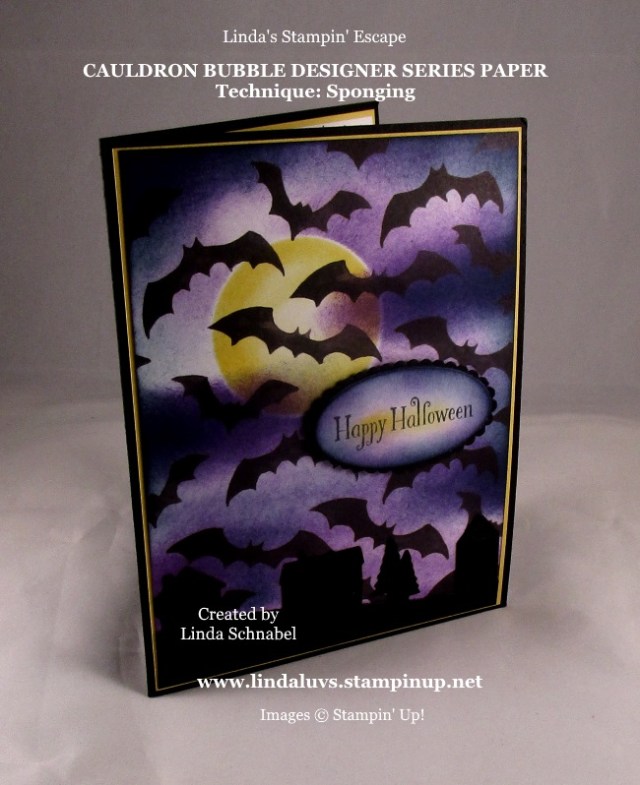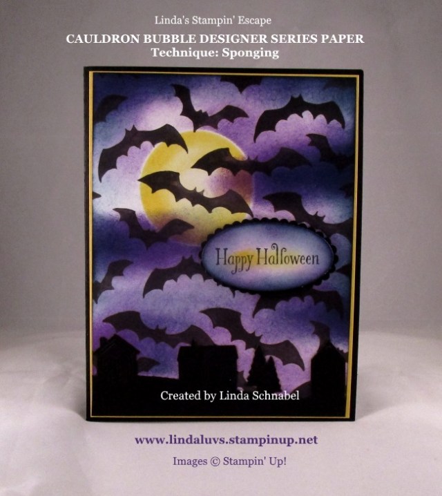 Today a I have a spooky little Halloween card from the Holiday Catalog. I’m featuring the Toil & Trouble Product Suite on pages 48 and 49. Today’s card highlights the Cauldron Bubbles Designer Series paper and the “Sponging” technique and has a fun little twist!