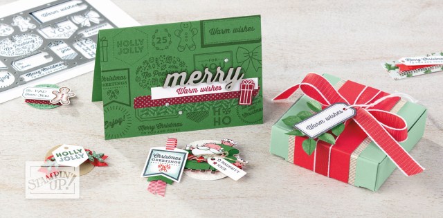The cute tags you’ve create can be used on gifts, on cards, and can easily be embellished. Do you see the “merry” on the card … that comes from the “Festive Farmhouse” product suite (I just ordered them yesterday). Did you also notice that the “tags” stamp was used for the background? How cool is that!!