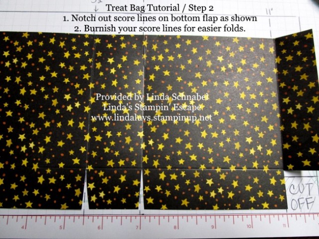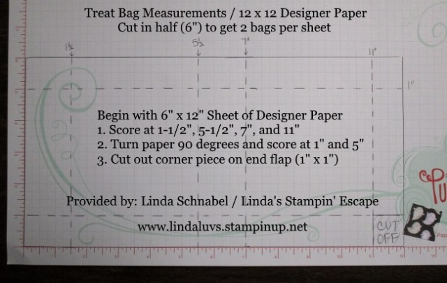 You will need any 12 x 12 piece of designer paper.  Cut in half … You will have 2 – 6″ x 12″ pieces and can create 2 treat bags from this one sheet.