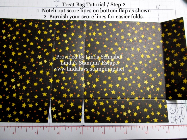 I always fold over (burnish) all my score lines – it just makes it easier to assemble.  You will notch out the score lines on the bottom (that is edge that has the piece cut out) See sample above.  Before you assemble you bag – You will fold over the top flap to reveal the second pattern and glue that flap down.  Now you are ready for assembly.