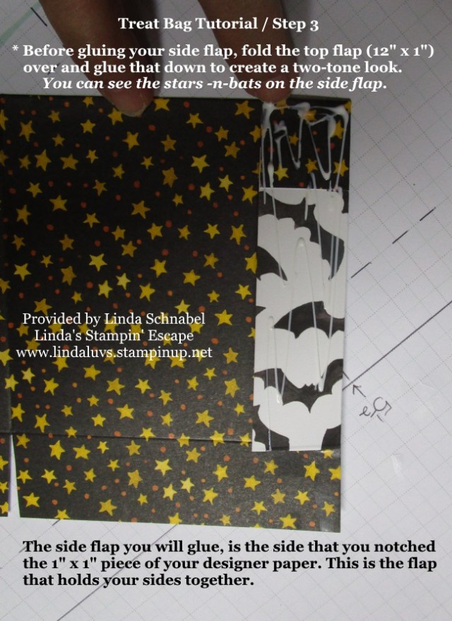 On the flap that has the 1″ x 1″ piece notched out … fold the flap in (the stars are actually the inside of this bag) and then align the flap with the opposite side of your bag.  I like using glue for creating bags because it allows you to move your flaps a little when aligning (it’s more forgiving) … the sticky strip and adhesives like that – once they’re down … they are down and there is no fixing that.  The glue holds beautifully once set.
