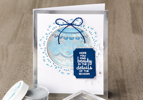 Either way, you can see the versatility of this beautiful stamp set and coordinating die set. If I was to pick my favorite of these three … Hmmm, it’s a hard choice but I may pass on the sparkle this time and vote for the elegance of the blue and silver.
