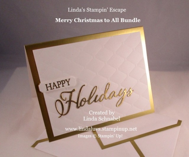Pretty right!? The base of the card is the Gold Foil Edge Cards & Envelopes!! You can find these on page 11 of the Holiday Catalog and you get 20 of each (card base & envelope). Then I simply cut a front to emboss, you don’t have to … you can go directly to the greetings which are from the “Merry Christmas to All” bundle. It can be that easy!