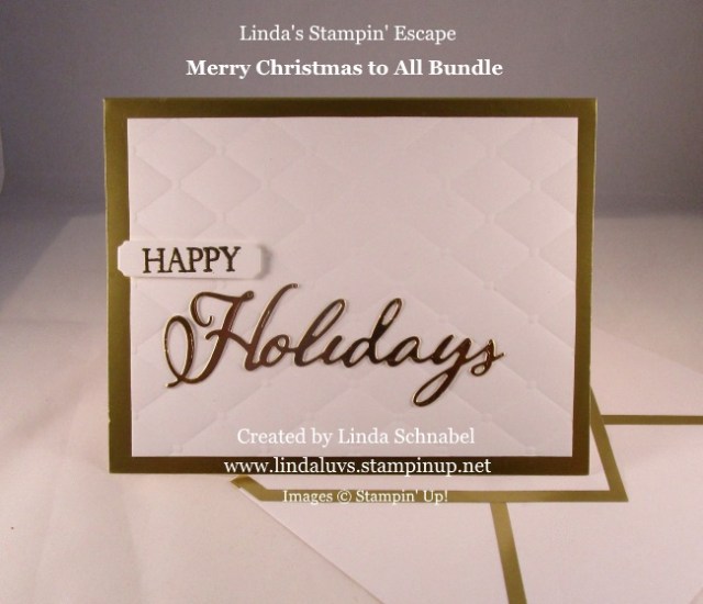 The “Happy” is heat embossed in gold and the “Holidays” is cut from the Gold Foil paper, again both are from the Merry Christmas to All Bundle from the All is Bright product suite found on pages 4 and 5 of the Holiday Catalog.