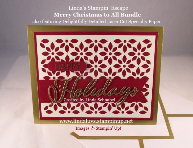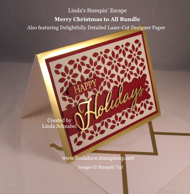 So in they style of keepin’ it simple, I am still using the Gold Foil-Edged cards, envelopes, and the Merry Christmas to All Bundle with the Gold Foil Sheets, BUT instead of the Vanilla cardstock … I’m using Cherry Cobbler cut to the 5″ x 3-3/4″ card front …