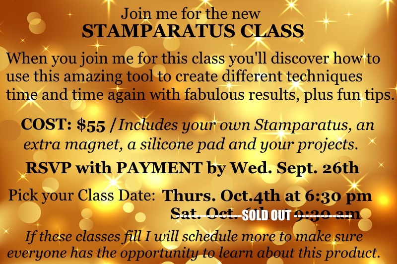 My Saturday Stamparatus Class is SOLD OUT but I have room left in the Thursday Night Class. Payment will have to get to me by this Wednesday so I can purchase your Stamparatus for class.