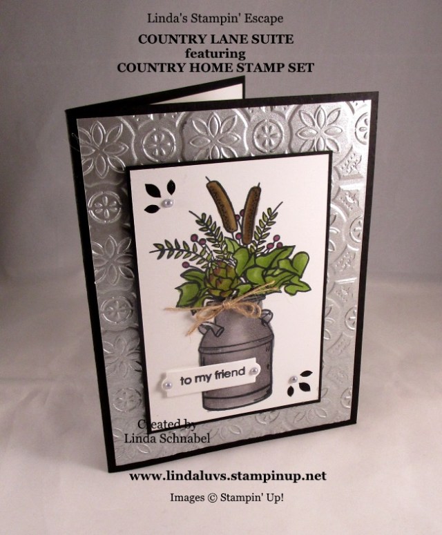 This month my clubs focused on the Country Land product suite on pages 42 and 43 of the Holiday Catalog. Today’s card features the Country Home stamp set, Galvanized Metallic paper, the Tin Tile Dynamic Embossing Folder and the Stampin’ Blends to create a simply beautiful card.