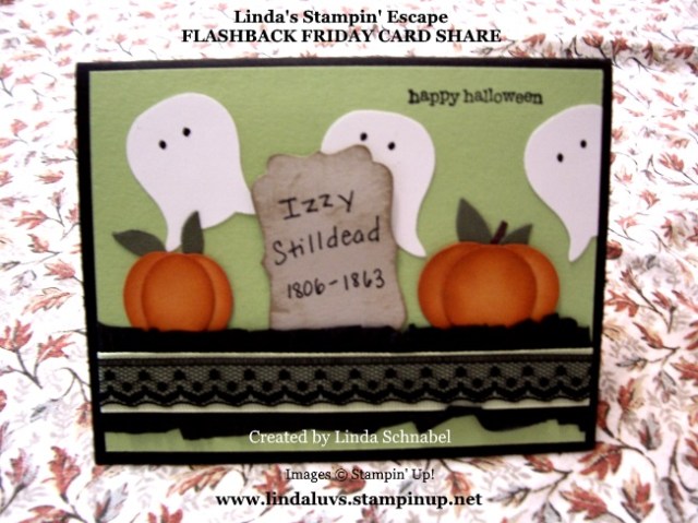 To make the gravestone I used a label punch …. I think the current “Everyday Label” punch would work great for the headstone! Then the stone was engraved (lol) handwritten by me. It was just a super fun card to make. Here is this years using the Paper Pumpkin September 2018 kit…