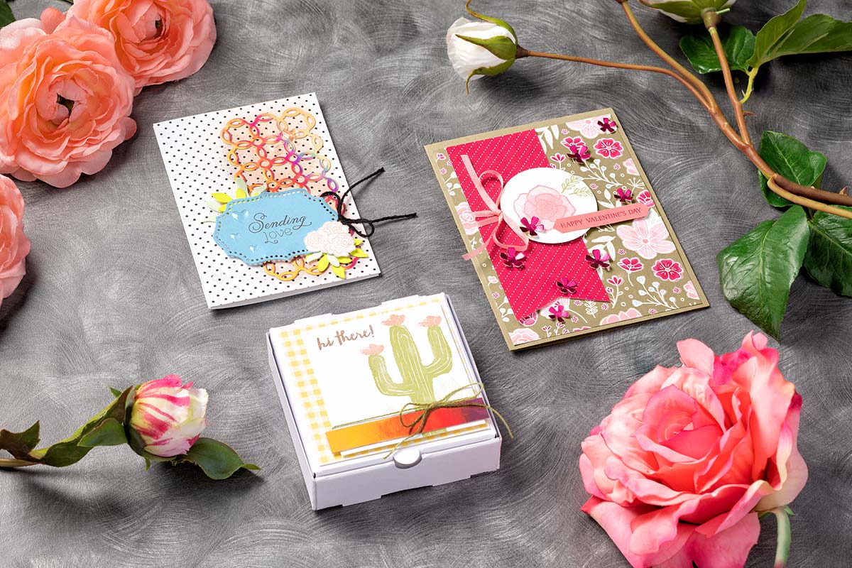 Foil sheets are the perfect product for when you want to add shimmer and pizzazz to a project. They can be die cut like we did on the “Sending Love” card, punched out into sweet little accents like the flowers on the Valentine’s Day card, or simply trimmed down for accent pieces like we did on the “Hi There” box.