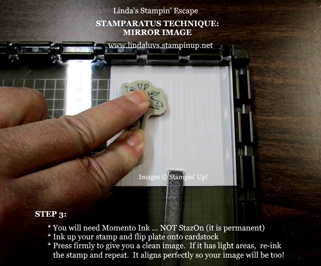 Here you can see that I brought the plate down over the stamp and with my finger I put a little pressure on the plate to pick up the stamp. Once you have picked up the stamp … you will flip the plate back up and ink up the stamp with Momento ink. Do not use StazOn … it’s permanent ink and will remain on your silicone pad.