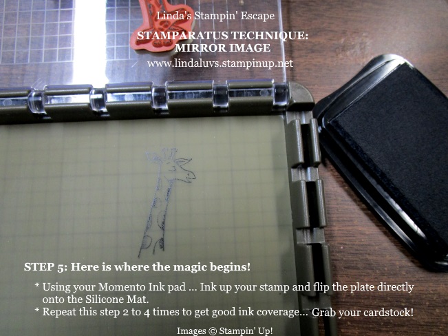 FLIP OVER THE CARDSTOCK so the image is placed against the silicone pad … you should not see any stamping on your cardstock. Tuck the cardstock back into the corner of your Stamparatus, then bring the plate over your cardstock and apply pressure to the stamp so you pick up the ink on the silicone pad. The picture would look exactly like STEP 3.