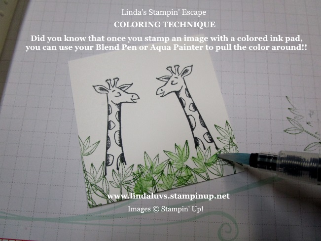 After we stamped the leaves around our giraffe, we used the Aqua Painters to pull the color from the stamped image to color itself … isn’t that cool!!